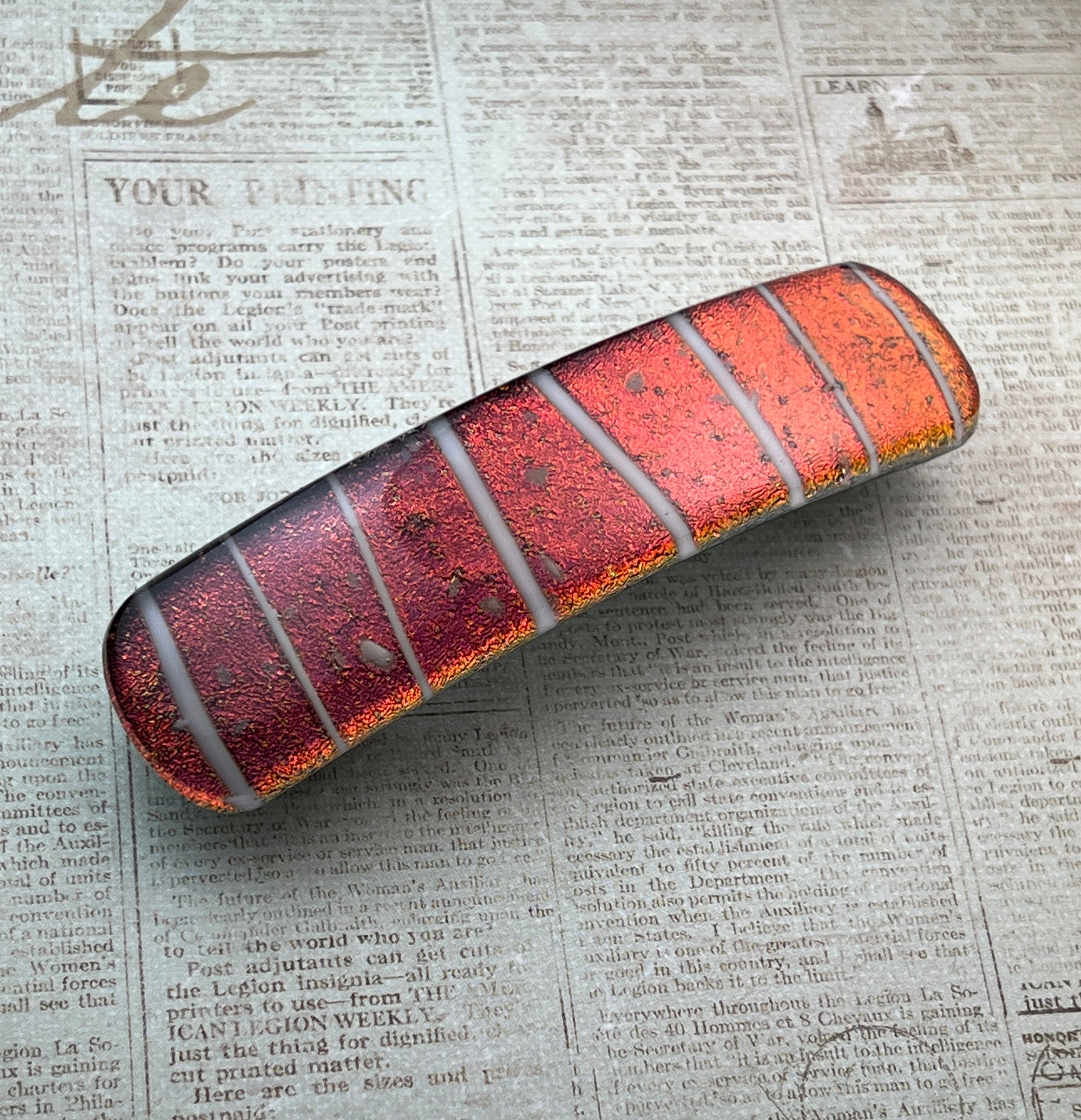 Handmade from scratch (by me) in my rural Ohio glass and etc. studio, this pretty red dichroic glass barrette features fun white stripes and sprinkles, and the photos are of the exact item for sale.