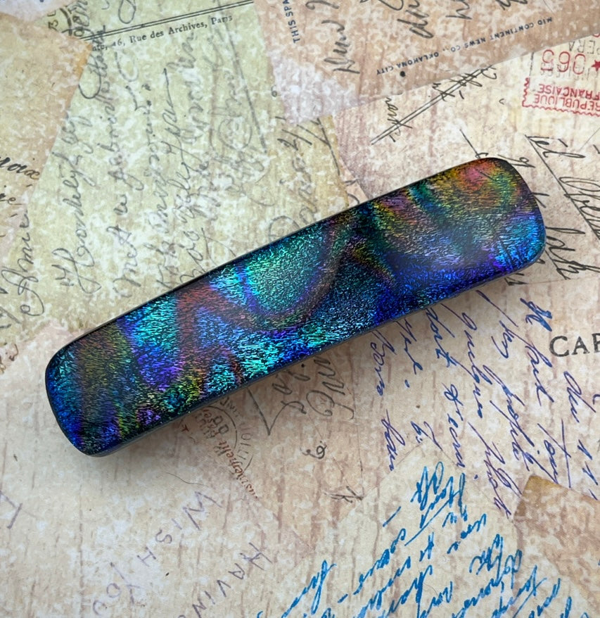 Made from a dichroic glass that I refer to as "the squiggle stuff", this barrette is handmade in my Ohio studio, and comes to you gift boxed. *Please note, I do make repeats in this glass*, but since the finished barrettes never resemble each other closely, the photographs are of the exact item for sale.